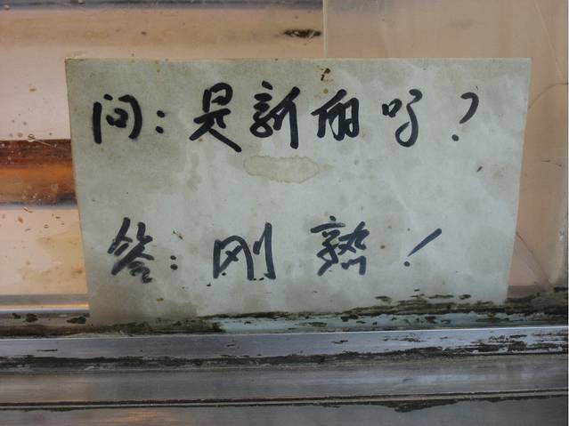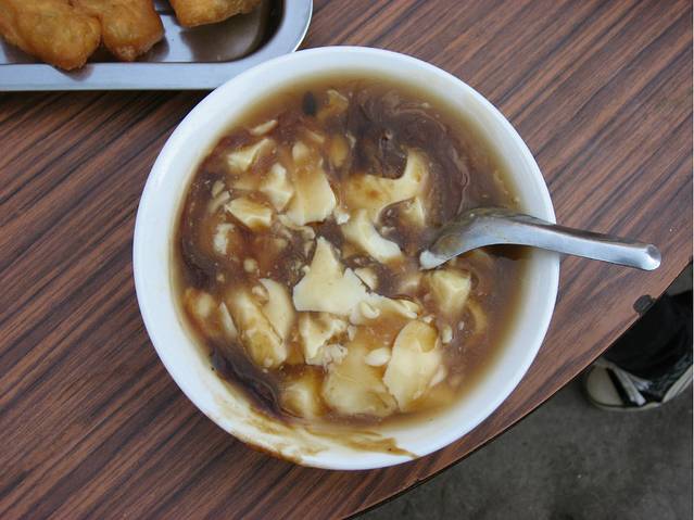 老豆腐(北京叫豆腐脑),小碗的1.5元; 那新鲜的豆花儿细嫩软滑,香气浓郁,卤子也精彩,您看那卤子的汤色,油亮度,还有芡汁的厚度(不是我拍的好,是人家的东西地道),两者相得益彰,惹人喜爱直至爱不停口!