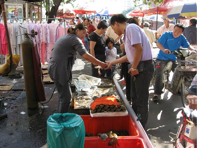 卖螃蟹的,生意也不错。记得天津有句老话叫:“当当吃海货,不算不会过。”看来,这传统一直延续至今也未改变呀,只不过现在吃海货不用当当了!