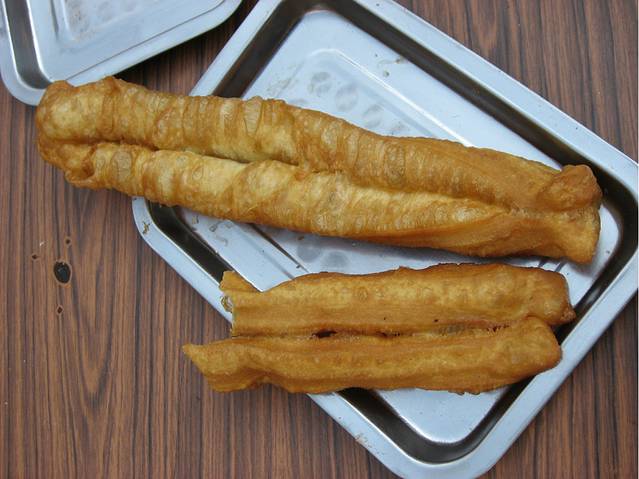 馃子(北京叫油条),1尺2寸左右长,小胳膊粗细,炸得很松脆,地道,好吃,香!一根才6角钱!太便宜啦,要不是怕吃不了浪费,我们还不得一人来它十根八根的!
