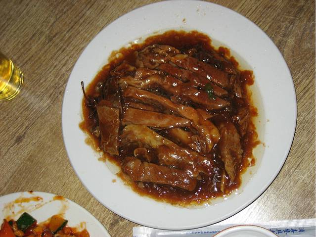 这是我们点的第二道菜,炖三样(22元),里面有鸡块,羊肉和面筋。此菜油比较大,您看盘子边上汪着的油都快流到桌子上了。此菜上得很慢,红烧舌尾都见了底了,它还姗姗未到。紫檀去问服务员,他说去催,又过了一阵才上来,我们猜:多半是忘了!这个菜点得不太成功,口味和红烧舌尾很相近,就是材料有所不同而已。这都因为我们不太了解清真菜的缘故,以后要好好研究一番啦,当然是用品尝的方式去进行调查研究了!