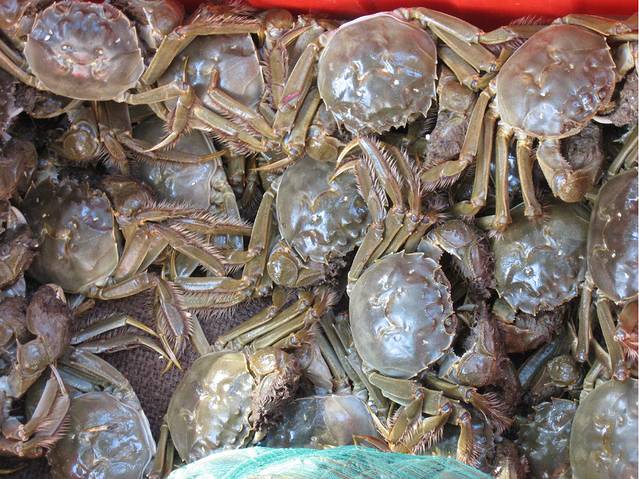 螃蟹,个个都是活的,不过是河蟹,个儿偏小,要是海蟹就好了,个儿大肉多,那吃着才带劲呢!各人有各人的口味,我比较喜欢海蟹,您呢?