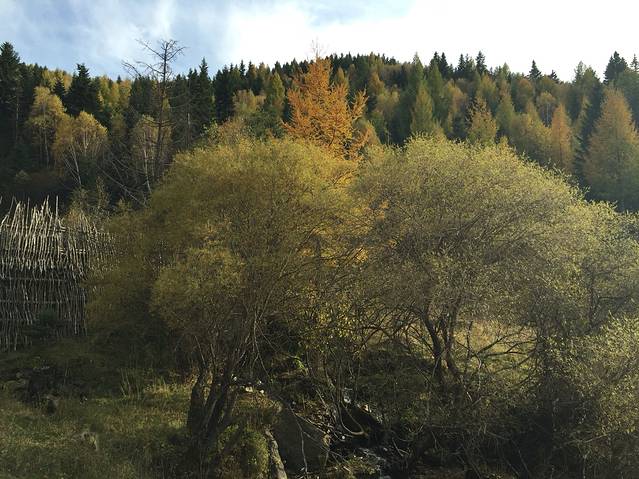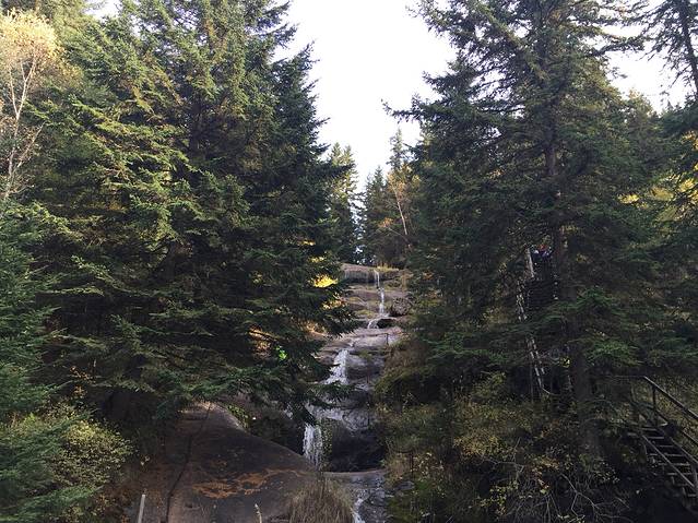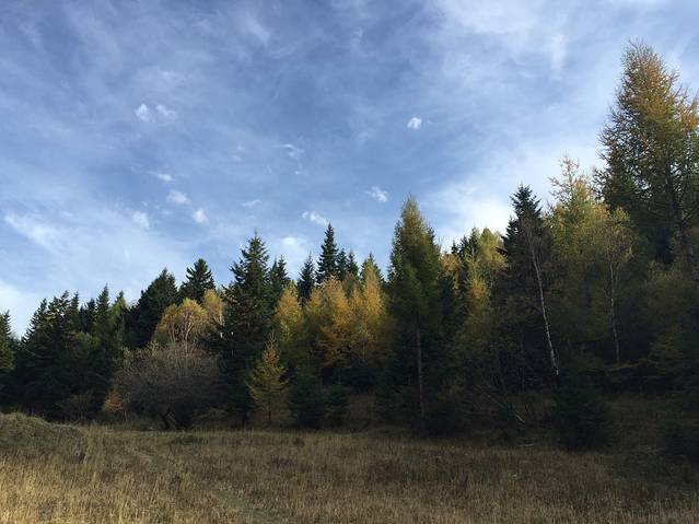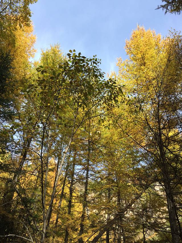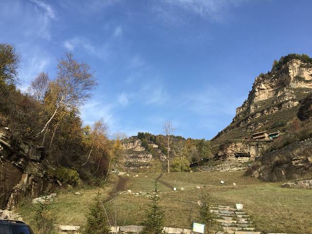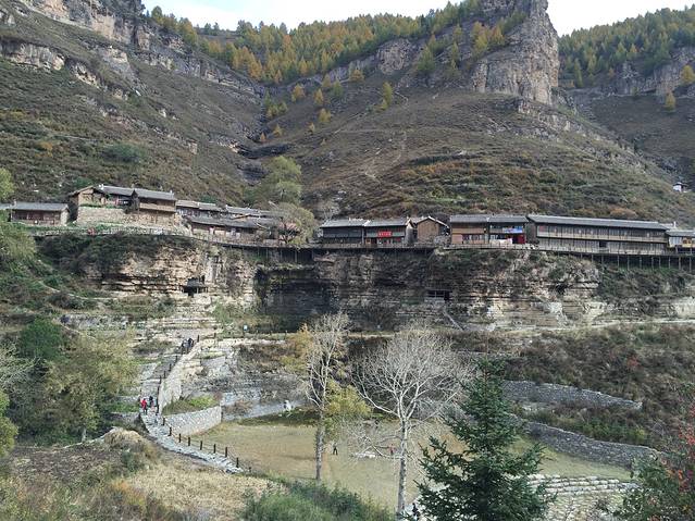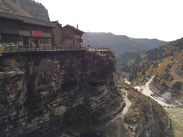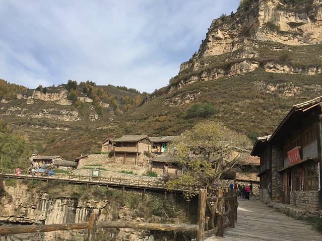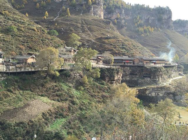 吃过早饭出发去悬空村和悬崖栈道。一路观赏两边景色,这里松树居多,也有白桦树,秋意渐浓,树叶变成黄色,红色。红,黄,绿,交替,真是多彩。悬空村到了,门票60元,有些贵,还要5块钱停车费。一路上行来的村口,抬眼望去。房子建在半山腰,被一根根的木桩顶起,村里的路都是木头铺成。房屋有些年头了,当地人也很朴实。