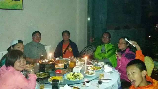 停电了,点上蜡烛接着吃。