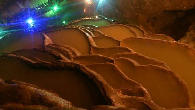 “神田”,不得不说真的很神,从上到下,错落有致,大小不一,每个梯田里都充满的水,在灯光的照耀下,金灿灿的,甚是惊人;如此奇伟壮丽的景观,为世界上罕见的一大奇观,被国际洞穴专家誉为世界之最。电影“千机变2花都大战”就是在此取景拍摄的。