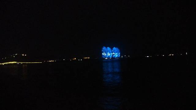 夜晚 三亚湾游泳 对面就是凤凰岛 四座建筑很别致 色彩缤纷的灯光构成三亚滨海旅游城市美丽动人的风景线