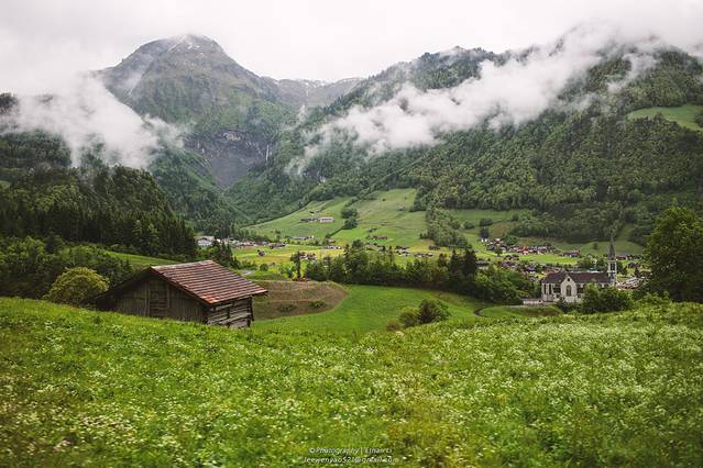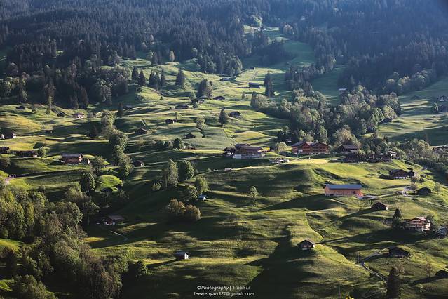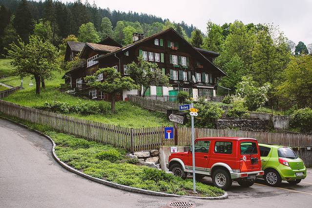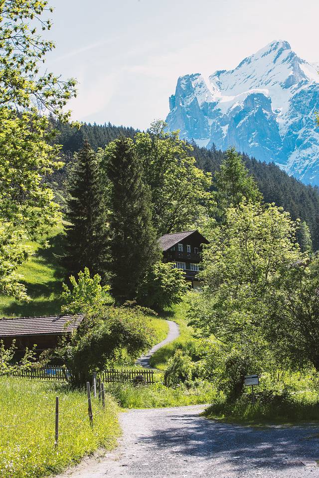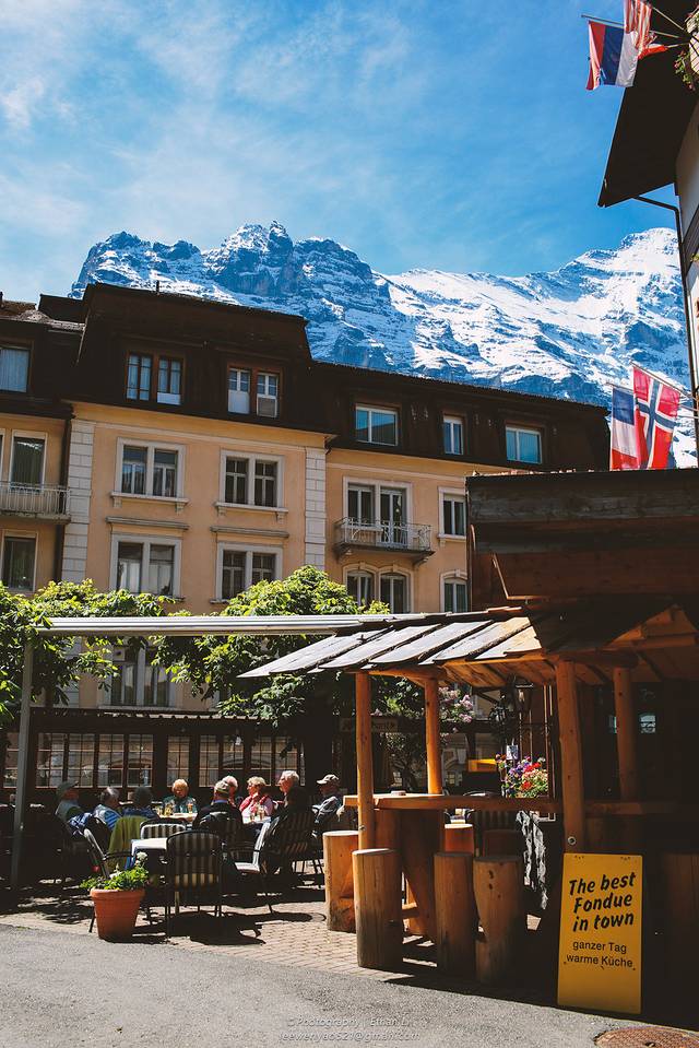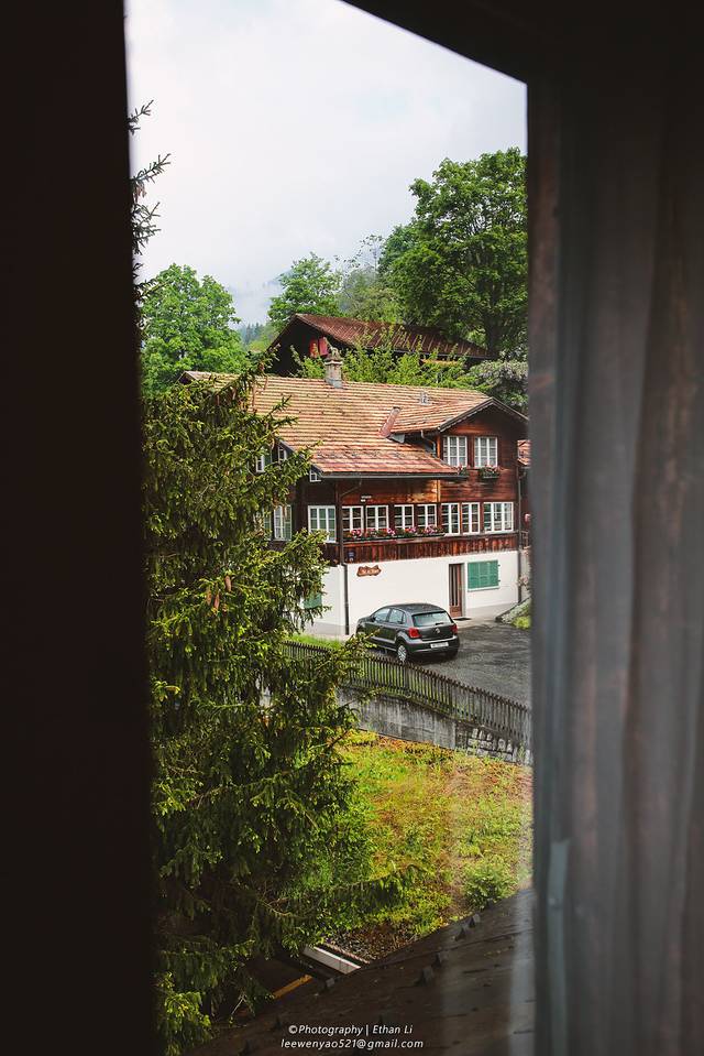 格林德瓦镇内其实就是一条主路贯通,几乎看不到人,非常安静。两旁是稀稀落落漂亮大气的瑞士标志性房子,另一边是梦幻山谷和雪山,住在这里的人真是太幸福了T.T