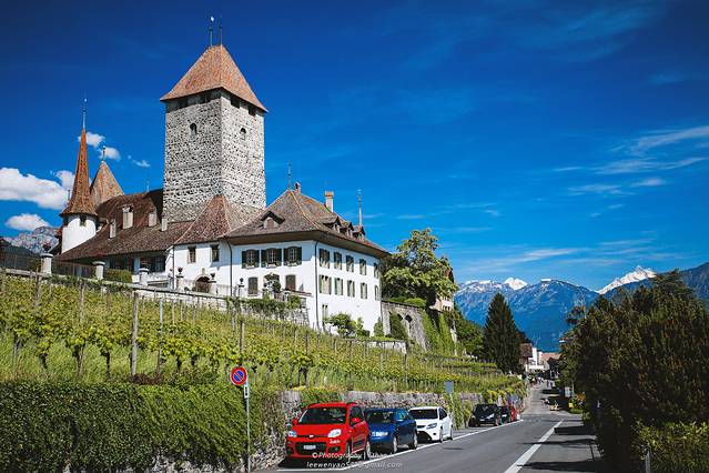 休息过后便向施皮茨城堡进发了。整个施皮茨被火车站一分为二,一面是往山上走,主要是当地居民区,安静祥和,我们住的房子也在这里,后文简称山上区;另一面是往山下湖边走,商业区、施皮茨城堡等位于这边,街上跑着很多老爷车,和苏黎世形成截然不同的景观,后文简称湖边区。山上区可以俯览图恩湖和对面的雪山。