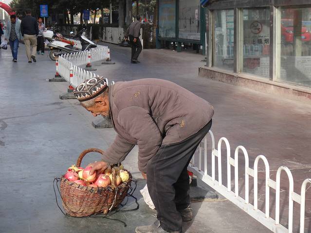 早上起床上街去转,看到的维族老汉卖石榴,买了个笑口石榴。。很甜的