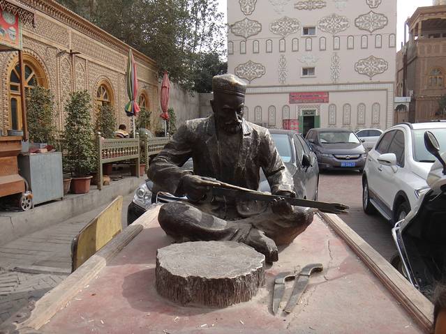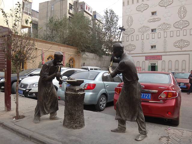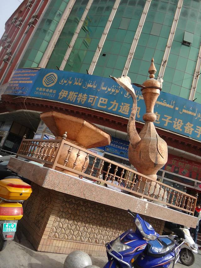 街边象征着维吾尔工艺的砖雕和铜壶。