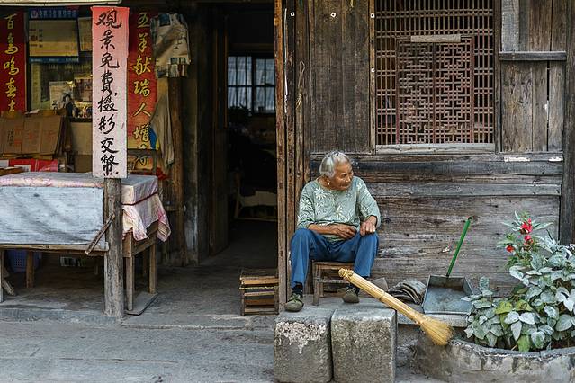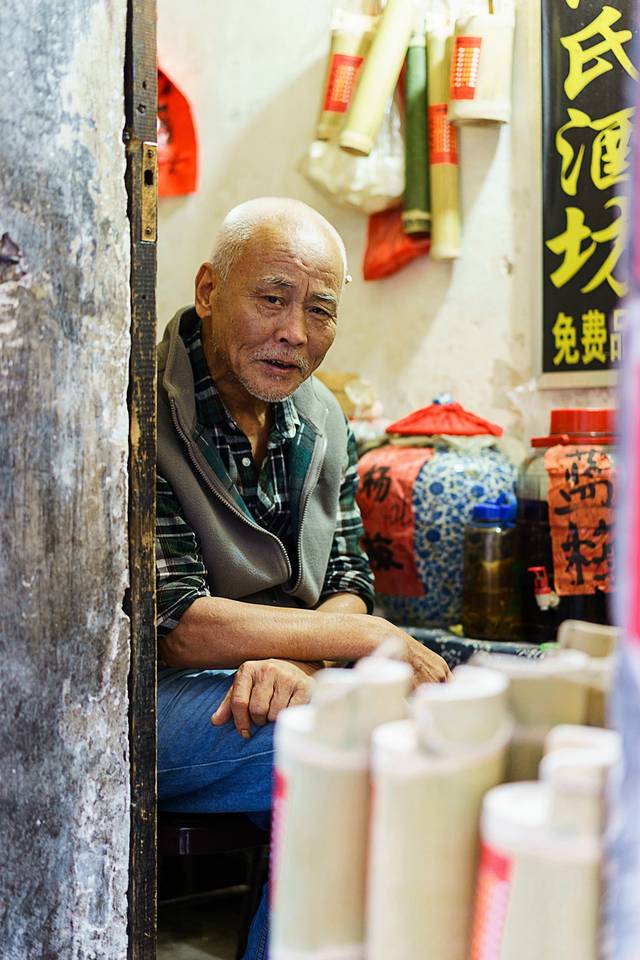 这位大爷十分热情,说不买酒也可以免费尝尝,无奈我是不喝酒的。我提出要给大爷拍照的时候,他欣然接受,说是可以给他做宣传。但实际上,宏村包括宏村一带的居民普遍不太愿意接受拍照,至于这位大爷,你看他别扭的姿势和面部表情,恐怕也是近些年遇到拍照的人多了,做的妥协吧。