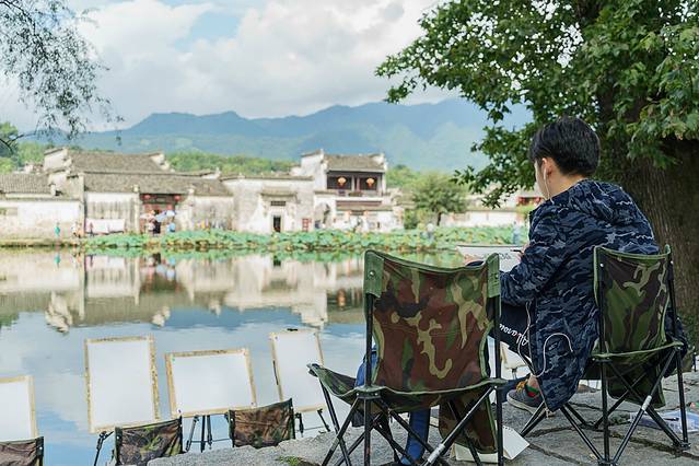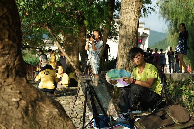 其实从宏村售票点进入,最先看到的就应当是南湖了。南湖是围绕在整个宏村的南边的,而且沿着南湖走,所看到的景色会有变化,所以整个南湖一圈都是学生。所以,我们先来看看学生好了,哈哈!