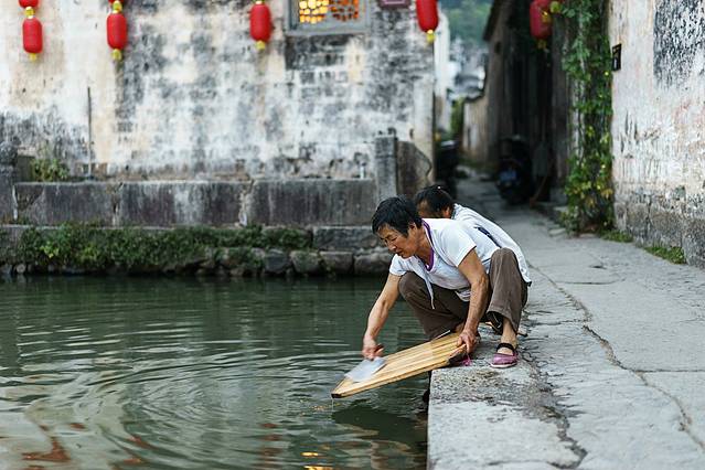整个宏村的路边都会有一条水圳(zhèn),这里主要是当地居民洗菜的地方。当然也有另外一个作用,顺着水流的方向走,能够走到南湖。