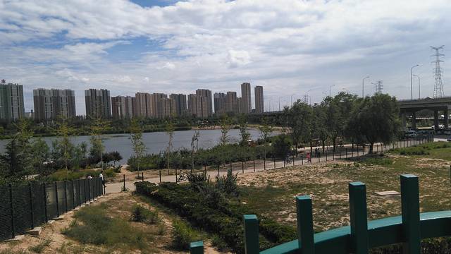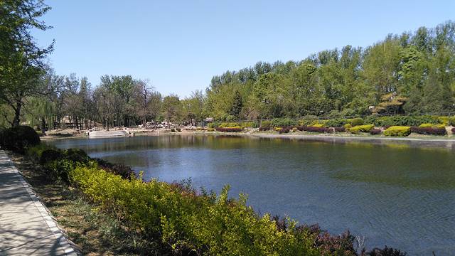 从南往北沿着湖畔建立了规模宏大的绿地景观。