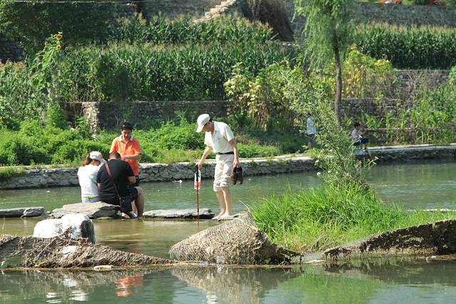 尤其,在我们中途吃饭的位置,有一段清澈河水,其中修建了墁滩。河中有连接河水两岸的石块,河水从石缝间流过,行人则可以从石块上走过,也可以淌着湍急的河水过去。河水很清澈,也很浅,刚刚没过脚面。可以看到水里许多的小鱼穿梭游动,不过,想要抓住它们可是要很大的功夫才行。