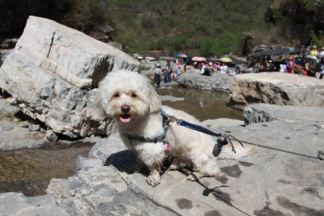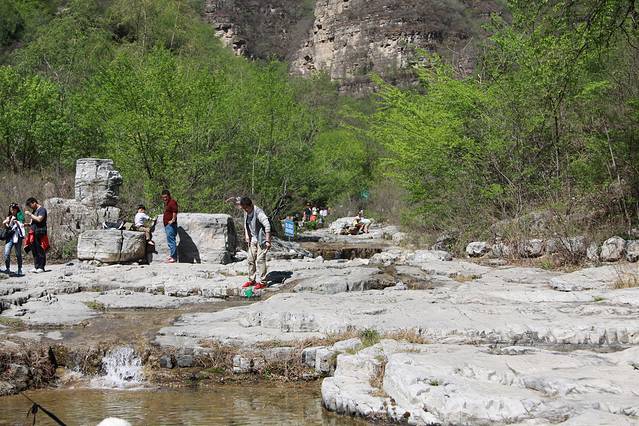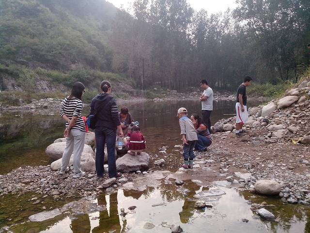 人很多,匆忙地走着。偶有游人在路边小摊买些山野菜之类的东西,沿途的清澈溪水和小蝌蚪还是最吸引孩子们的好项目。进入景区的小狗们也在水里玩的不亦乐乎。