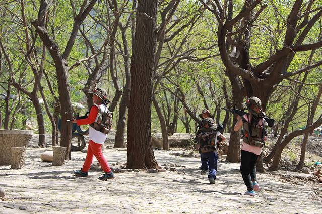 午餐后的主要项目还是玩,十渡区域游玩的项目也算不好,什么蹦极、漂流、竹排、划船、真人cs等,带着孩子们的我们选择来场大型枪战----真人cs。