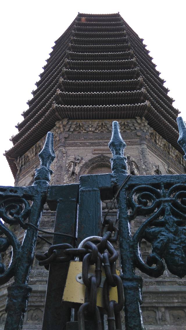 偶然的路过,没有什么惊喜,只是感受到古代与现状的隔膜。当静静地看那古塔之后再转身,那种顿挫的差异感让人有些迷茫,尤其再去回想冰冷铁栅栏上的大锁,有种莫名的忧伤袭来......