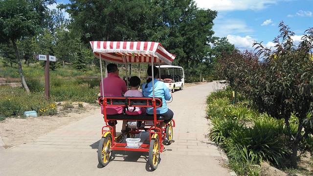 吃了饭,找了住宿的地方。又拍了夕阳美景后,我们租了两辆三人自行车去玩。那车是两个大人骑行,坐在最前面的小孩子只能牢牢地抓紧扶手,目视前方。本来以为随便骑骑车没什么好玩的。但是,真正骑上去后,由于山路坡度大,而且我们进入了村庄,从古城门到石坡路,从村中有规模的农家大院到村外泥土路尽头的残存土城墙,从废弃的农宅到碎砖路中的古树......速度和视觉的冲击,以及颠婆的感觉都十分的刺激。孩子们玩了一遍又要在玩一遍,我们沿着村庄的道路上坡下坡,冲刺爬坡,跑了一圈又一圈。引得村中的路人都为我们加油冲锋。