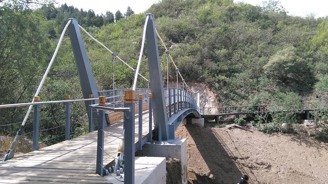 依照路牌我们走向天摩沟木栈道,发现了一座铁桥,桥下正在施工中,这里一定是天摩沟,暂时无水。