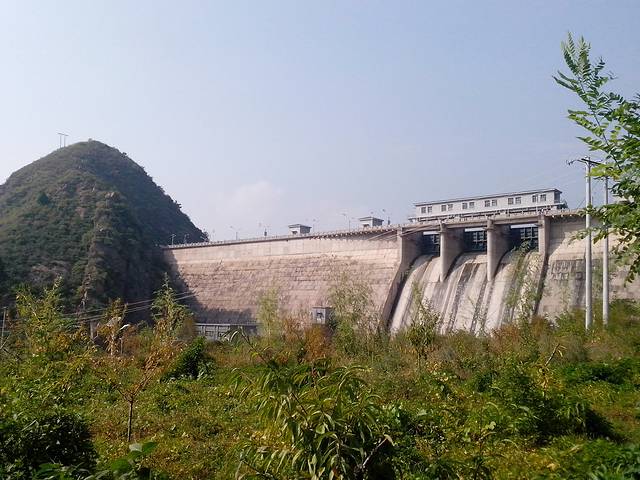 近看大坝,水闸关闭,只有涔涔的遗漏出的流水。