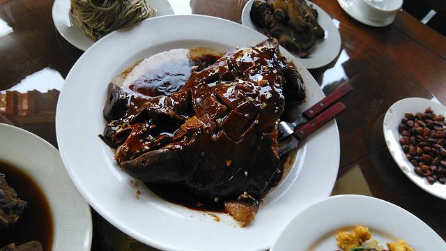 跑回十渡我们定的餐厅,好家伙!这大菜上来了,是什么?大家看看,给说说哦,当地有名的一道菜。