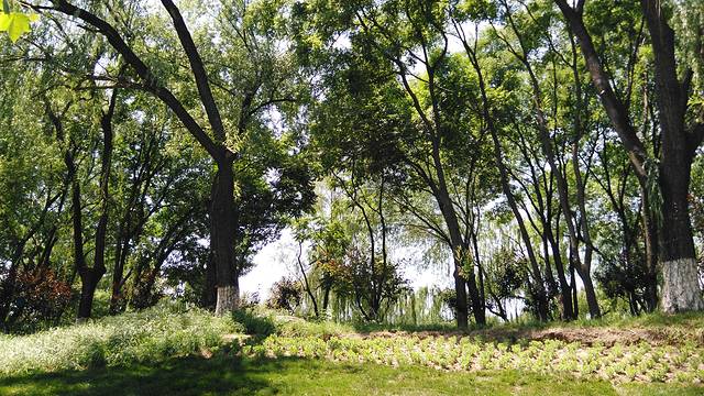 走过宽敞的城市公路,路过青青的农村田地,经过一片片无名的小树林,遭遇一种柳暗花明的感觉,我们到达了妫河森林公园。这是一片郊野公园,没有大门与围墙。,似乎是一个入口,只有小小一片可停车的地方,不起眼的地方表示中这里是个公园。