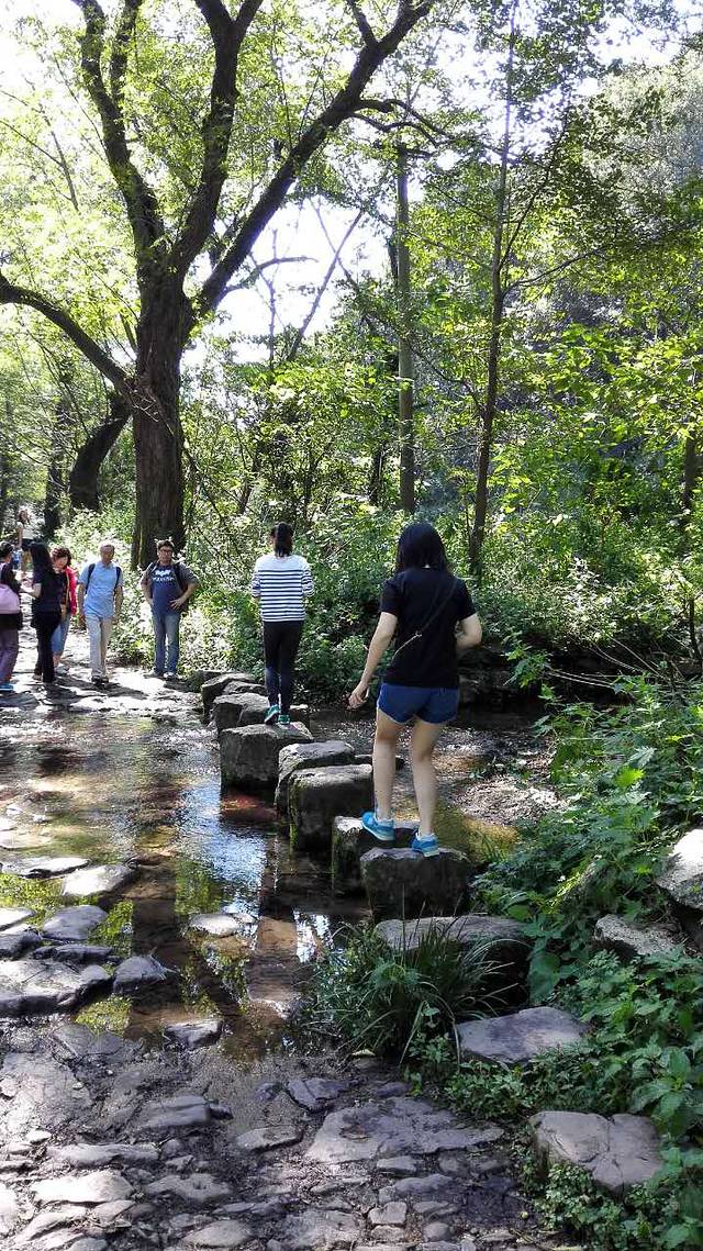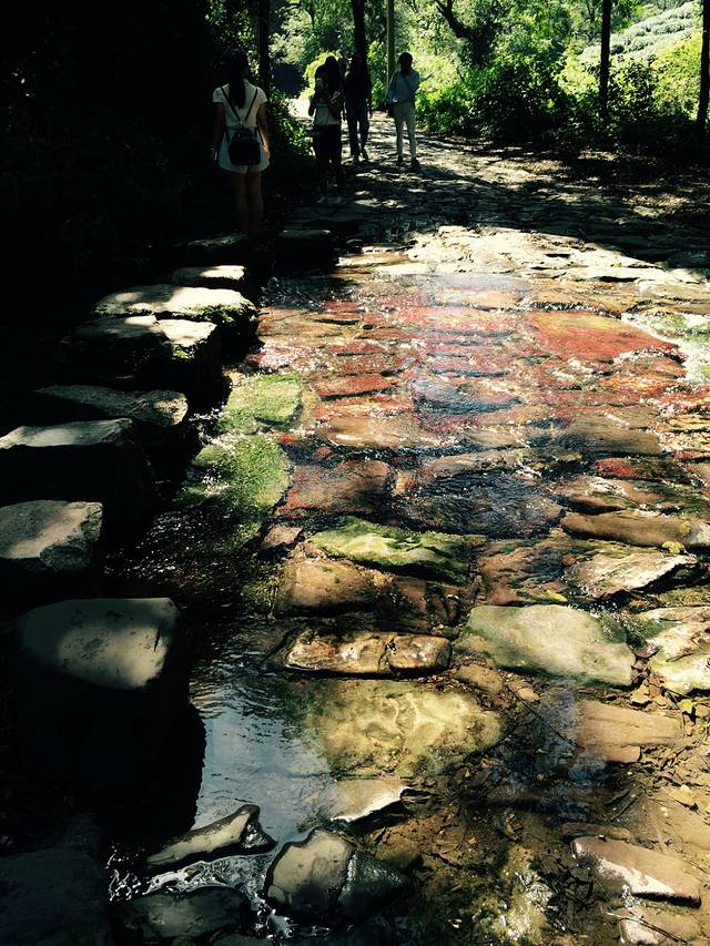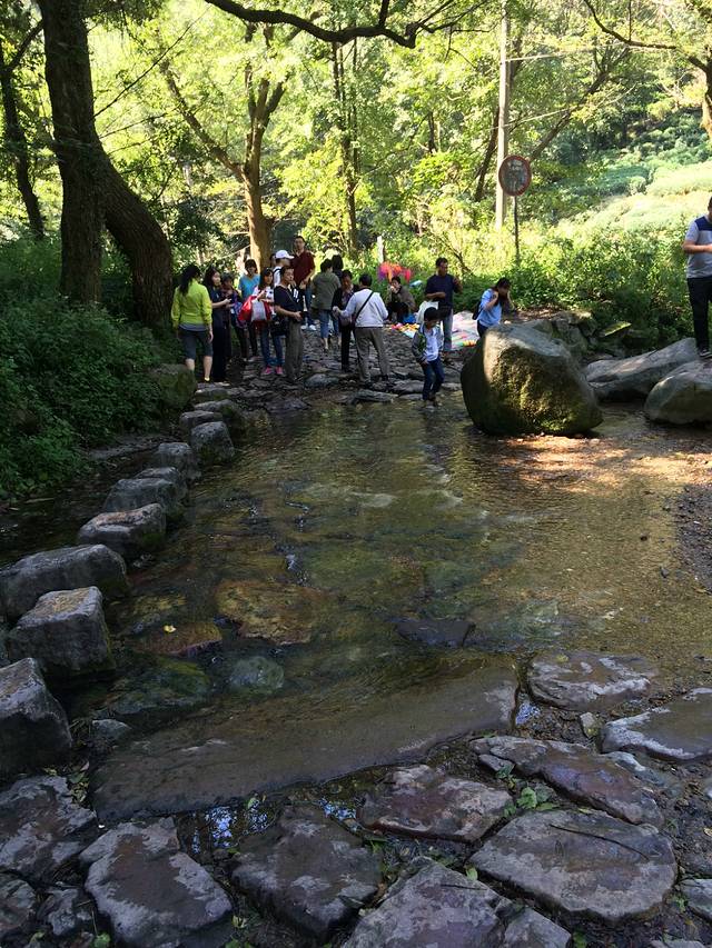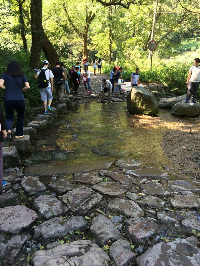 第二天早上,吃过了“咬不得”生煎后直接坐公交到龙井村,(生煎的味道很好吃,吃的时候要小心一点,不然会很容易烫到嘴)先是徒步九溪十八涧,走一段路就有一条溪,要是穿凉鞋的可以直接踏着溪水过溪,当然,溪的旁边有石头,踩着石头过河的感觉也是不错滴。我们过第一条溪的时候,就有一个帅哥因为鞋滑没踩稳一脚踩进水里了,还连带着自己的媳妇也掉下去了。不过好在天气好,鞋湿了也并无大碍。