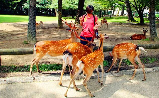 奈良公园是奈良最著名的景点,也是每个到奈良的游客必去的景点,奈良公园最吸引大家的就是鹿,鹿也是奈良公园的象征。各种呆萌,各种奔跑,各种拜托鹿饼的憨态,实在是讨大家的喜欢。注意买好的鹿饼一定要藏好,否则很快会被围攻的,各种撕咬,衣服是会破的哟,别怪我没提醒你。