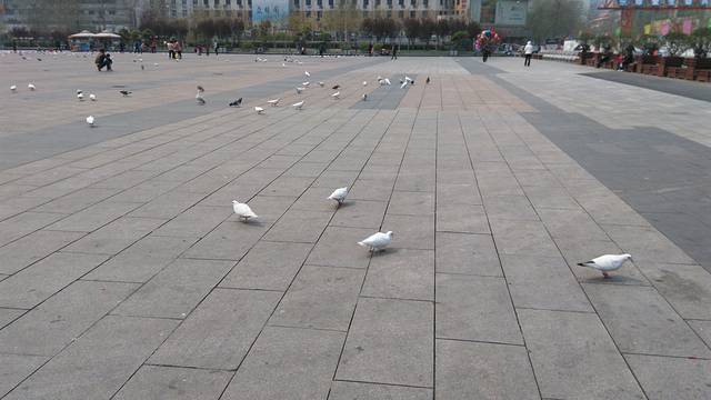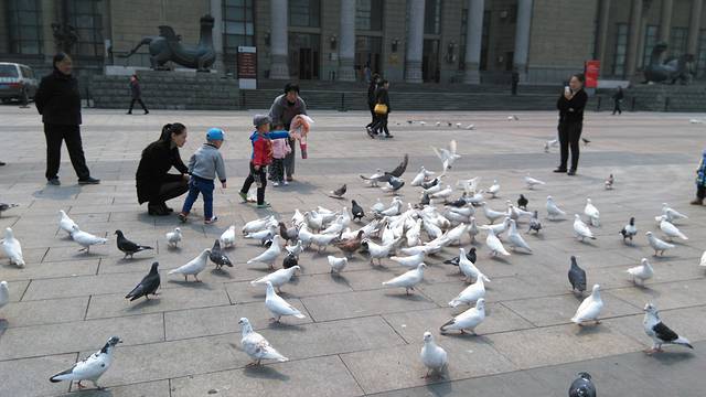 平整的广场散养着鸽群,市民们投食着鸟儿们。一片安静与祥和之气。