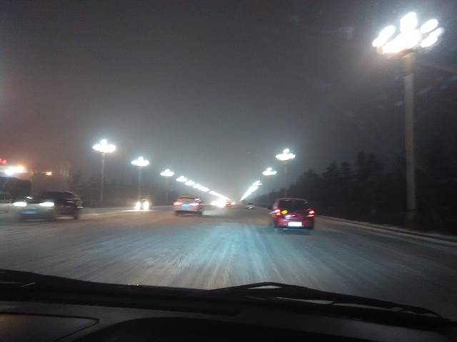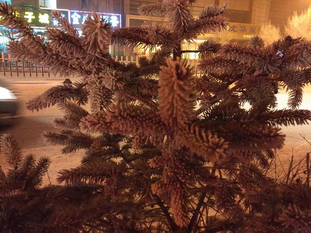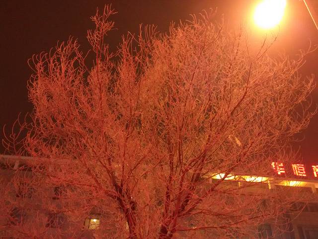 大街上雾气朦胧,好似帝都的雾霾。但,绝对不是。那是真真实实的雾气,树木都结了霜,满树白白的。到处都是“雾凇”的景象。