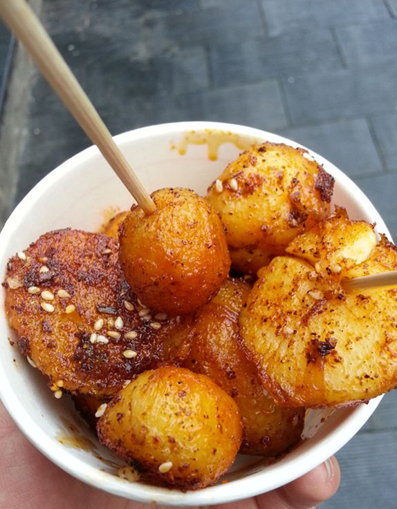 小土豆,有的很软很糯,有的欠火候,香辣味。小份是5元,大份是8元,这个是5元份的,可以够2人吃。