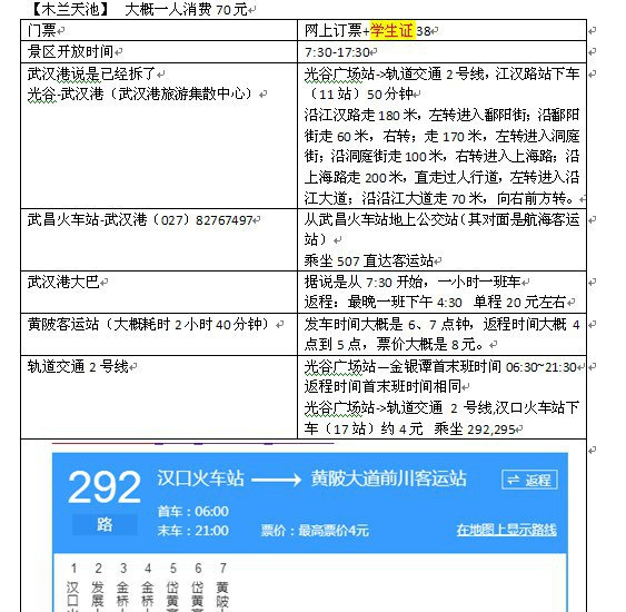 去武汉之前,为这次旅行做了很多功课,把它视作一次毕业之旅,也当做自己独自一人去旅行的一次考验,看看自己究竟能走多远,在网上查了很多武汉以及武汉周边的景点,有太多的地方想去看看,所以就查阅了很多路线,不一定有时间都去,但是有备无患还是必要的。这些小准备在走前都缩印了出来,夹在随身携带的小本子中,到了真的想要查询的时候,手机,pad什么的都不如,轻而易举掏出的”小纸条“方便,还有很多地方,比如:衡山,九宫山。这些地方的始末班车,我在出行前都向当地的114要来了长途汽车站以及景点服务部门的电话,询问确定了一下。也将这个方法推荐给大家,一个人的出行,为了计划的尽量全面,也为了让家人太放心。