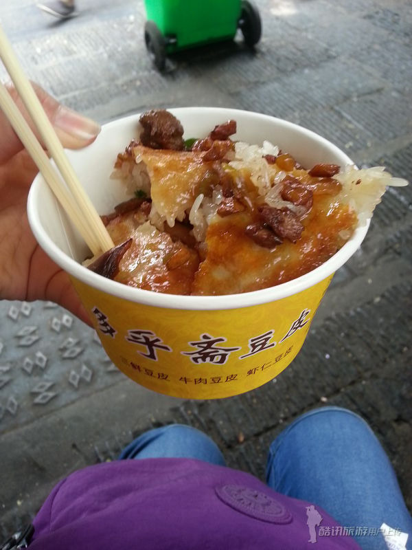 糯米下托了一层很薄很薄的豆皮,撒上了些肉丁、咸菜丁、豆干丁,挺香的,但是吃多了会感觉很腻。7元一份