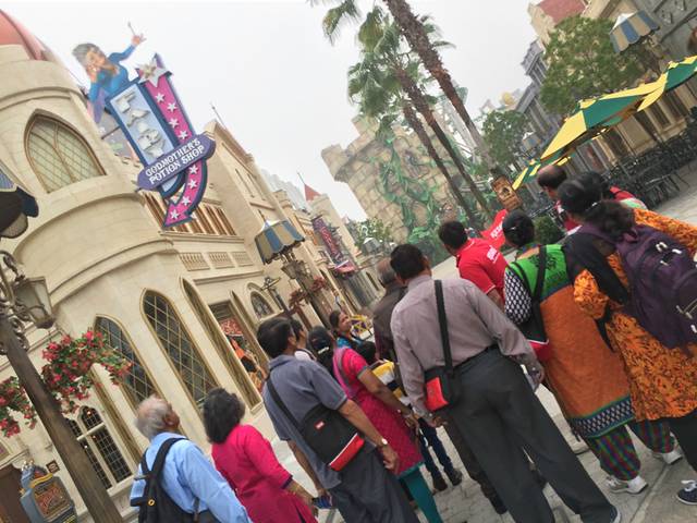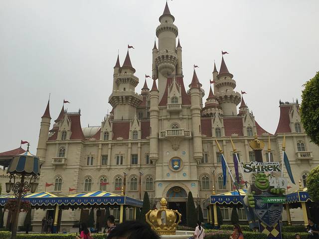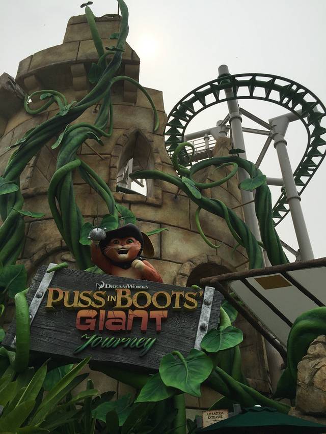 再往前走是遥远的国度(Far Far Away),这个是根据怪物史瑞克系列故事打造出来的一个巨大的梦幻的遥远王国城堡,里面是史瑞克4D电影。我们也在这里搭乘了我们第一个游乐项目,全球首个《鞋猫剑客历险记》主题悬吊飞车。这是一个家庭式过山车,最高时速的地方大概是30公里每小时。我是那种坐过山车一定会尖叫的人,不然觉得心脏一直往下掉没地方放啊,于是坐在我旁边的人总会抱怨他的耳膜快破了哈哈。我们从四层楼高的地方出发,在高耸入云的魔豆藤蔓中追赶金蛋,忽上忽下,时快时慢!从这个飞车出来KH又带我们去了下一个过山车“小龙飞行学院”,说是给孩子们打造的过山车,时速大概40公里每小时,平时坐磁悬浮时速400公里也没感觉啊,这个40公里露天啊加上过山车特有的吭哧吭哧地声音看起来有点恐怖了。