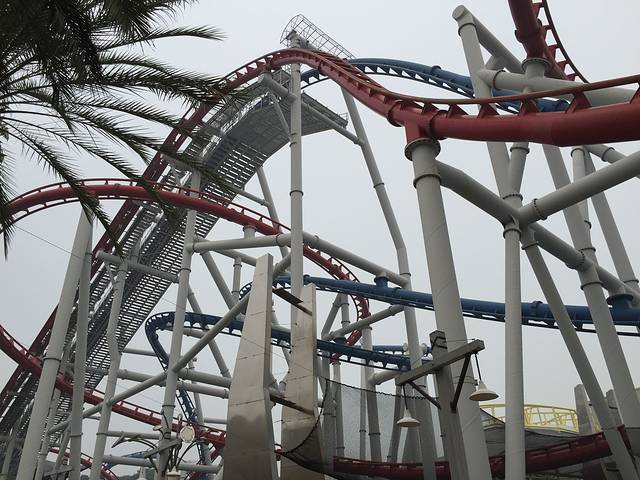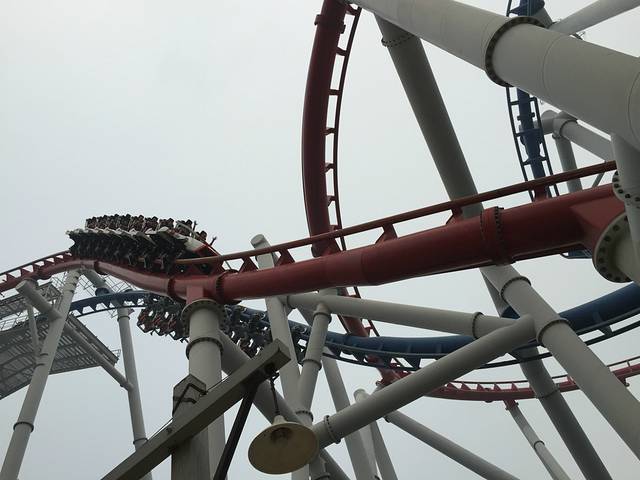 比如这个“木乃伊复仇记”,有高速相机给大家拍照,出口的时候可以展示给游客供选择购买,我想大部分正常人在这样的速度下都是惊呼到表情有点扭曲变形吧,可是我们同行的还有两位大神好像淡定到在微笑摆造型一样;另外每个人的惊恐点也不一样,比如“天幕飞行”我觉得还好,Mandy就对于双脚在空中晃荡这件事情觉得非常恐怖,她忽上忽下的过山车倒是不怕的。