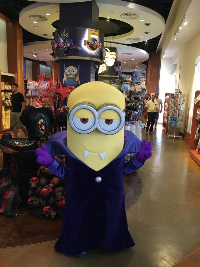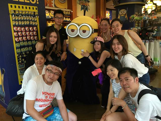 整个新加坡环球影城一共有七个主题区,大体呈圆形分布,所以逛完一圈正好回来。一进入环球影城的第一站是好莱坞(Hollywood),“星光大道”两旁是让人目不暇接的餐厅酒吧和购物场所,配上带感的背景音乐,不论是大人小孩来到这里我想都会像是到了真正的梦工厂一样,把现实生活中的苟且都暂时忘掉,把自己想象成是一个大英雄,来拯救世界吧!我们的导游叫KH,是一个胖胖的很可爱的新加坡男孩,在他陪同我们的两个半小时之内,我们一共游玩了七个娱乐项目,还安排我们跟最近风靡全世界的小黄人合影拍照,而且还是万圣节版,披着迷幻紫色风衣的小黄人哟,真是可爱死了!