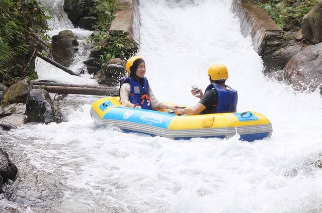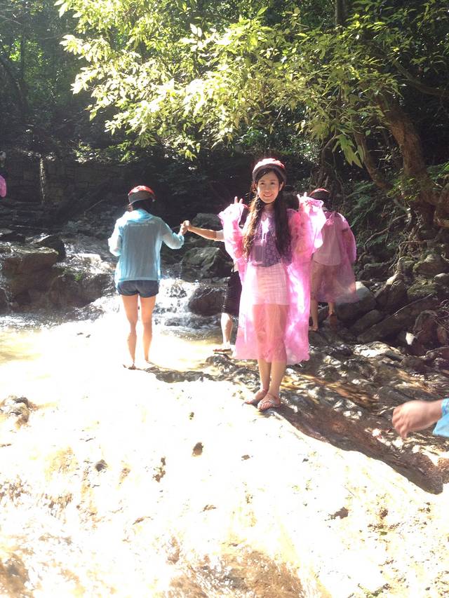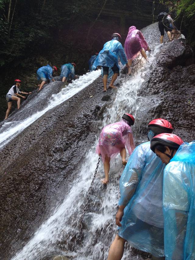 古东瀑布,进门一路飘着竹筏到达爬瀑点。可以在瀑布上攀爬,是吸引我们游玩的主要因素。购买了豪华防水套装:脚系麻绳草履,身披透明雨衣,头戴安全帽,感觉身着游戏套装哈哈!一路上爬过三个瀑布,中途时而弱水潺潺,时而深水巨浪。踩着清凉的泉水,爬过湍急的瀑布,彻底放松身心,仿佛融身大自然!!
