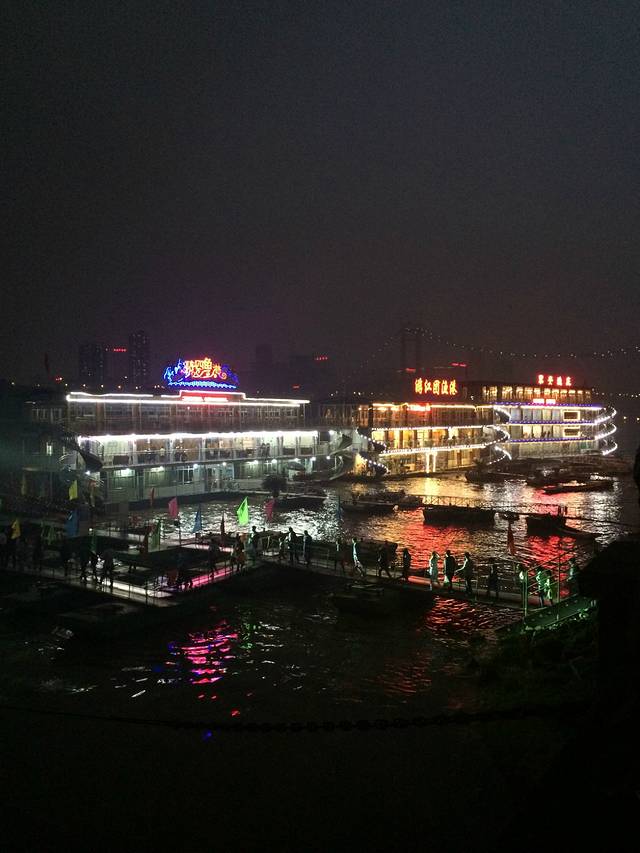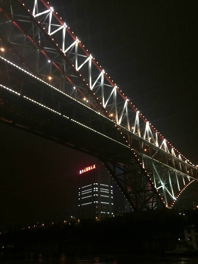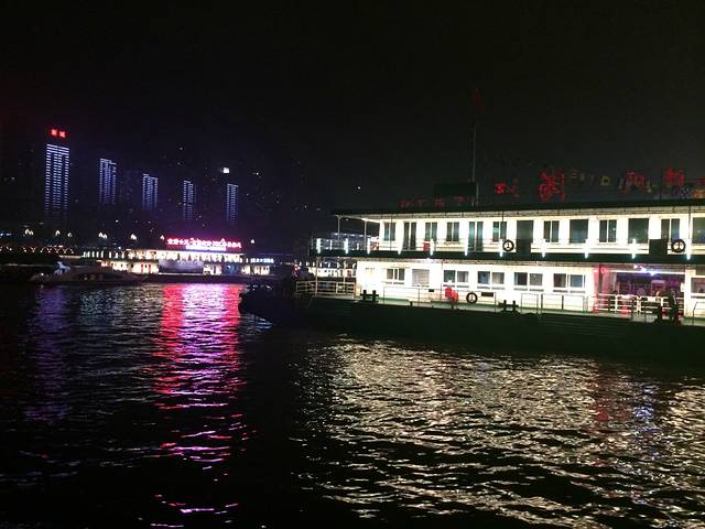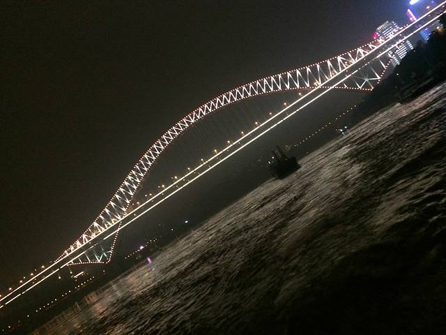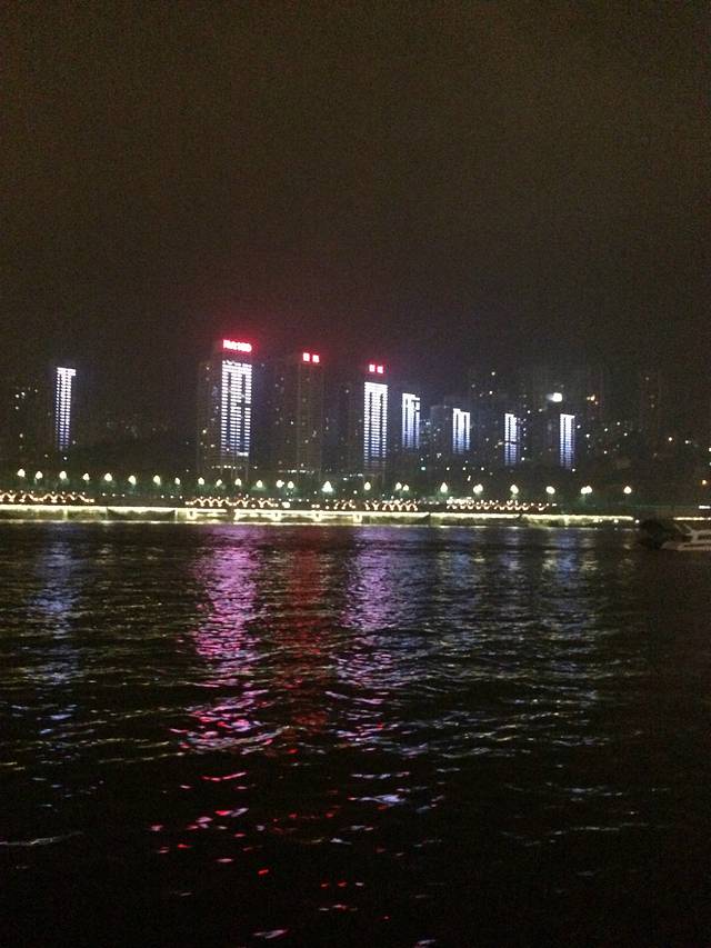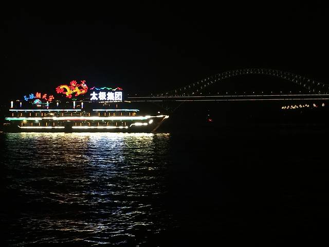 我们比较幸运,从洋人街回朝天门的游船到的比较迟,天色已晚,我们15元的游船坐成了夜游船,(夜景游船最便宜的也要100多一位)途经3座长江大桥,白天就很壮丽,晚上配上霓虹灯,更成为一道道迷人的风景线。两岸的高楼也都亮起了霓虹灯,好美的夜景,强力推荐!