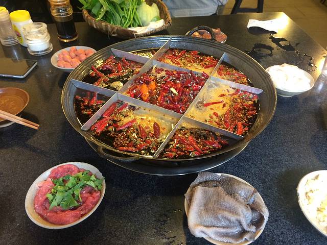 说起重庆的美食当属火锅当仁不让了,不过我们是穷游,一共吃了两顿火锅,奇火锅,我们点的肥牛鸳鸯锅,酒友老火锅,我们点了九宫格,看着就过瘾! 还有重大发现——重庆人吃火锅蘸油碟,也就是芝麻油。 火锅本身很辣,蘸了油碟以后吃着就好很多。没有涮羊肉,有点遗憾,不过很纳闷重庆人为什么不喜欢涮羊肉呢?