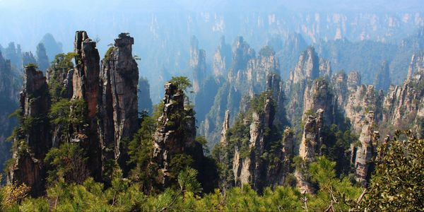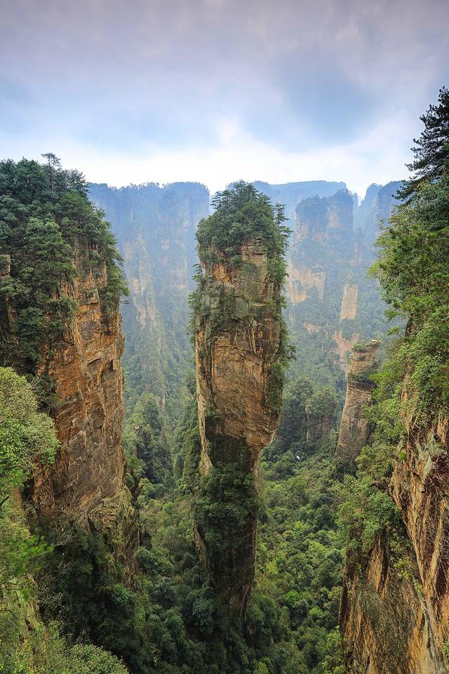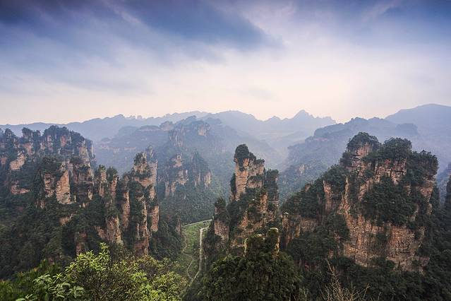 袁家界位于武陵源核心景区,与金鞭溪一衣带水,东接索溪峪,南眺鹞子寨,西望黄石寨,北靠天子山,从袁家界就可坐环保车去杨家界、天子山(张家界国家森林公园各景区之间都有环保车通达,可免费乘坐)。著名电影《阿凡达》就是在这里拍摄取景的,所以一直特别想去看看。
