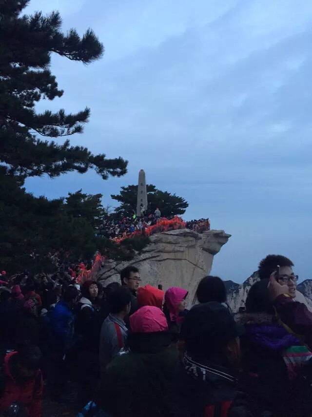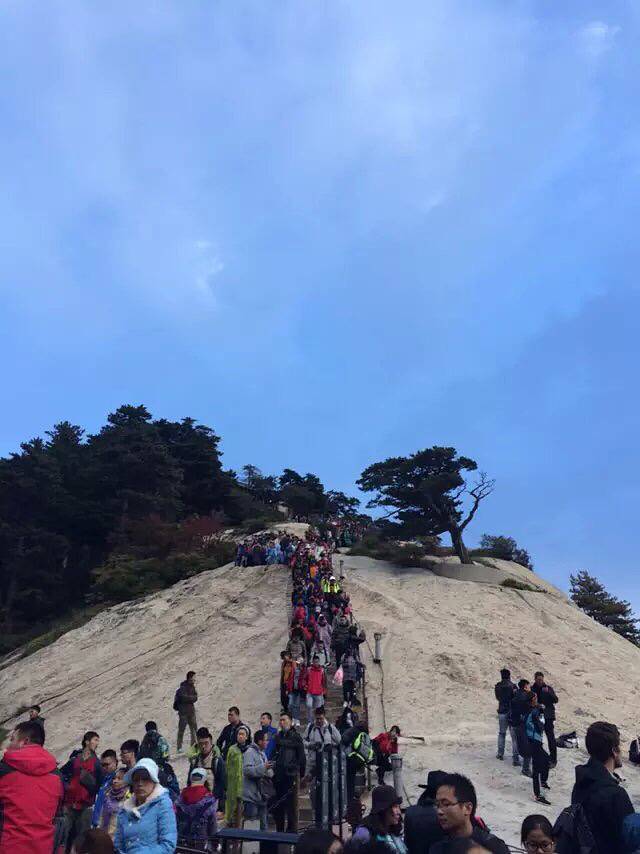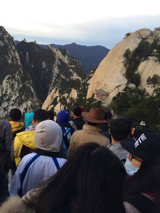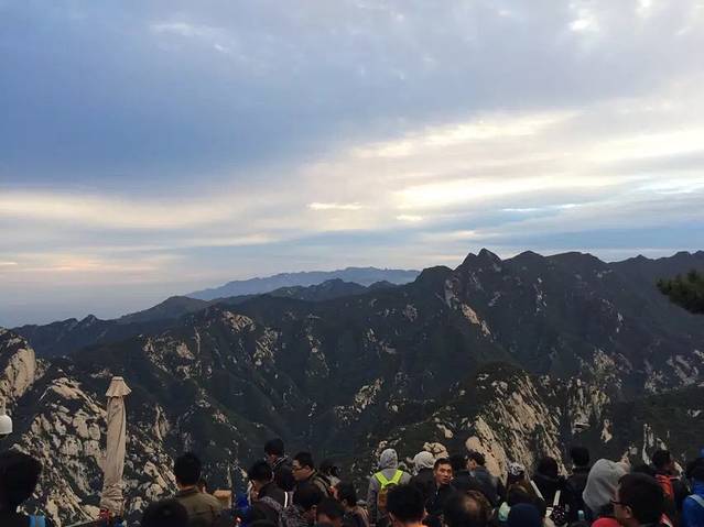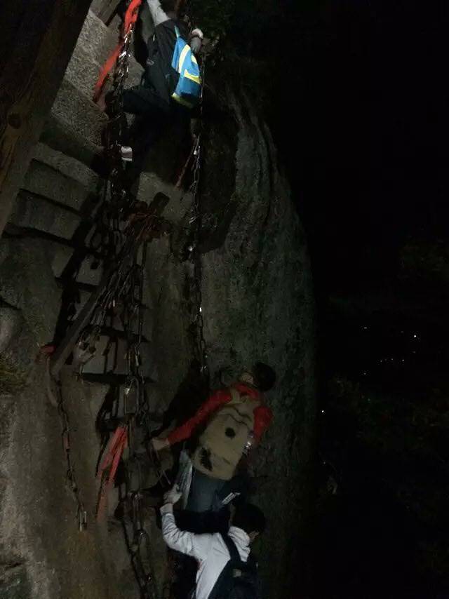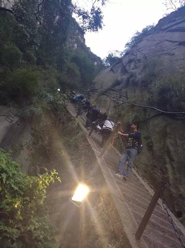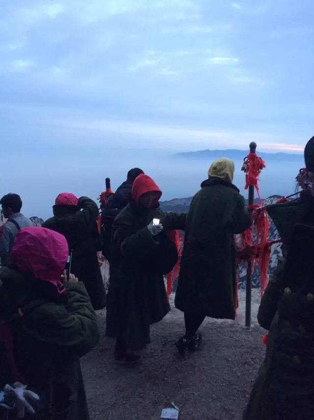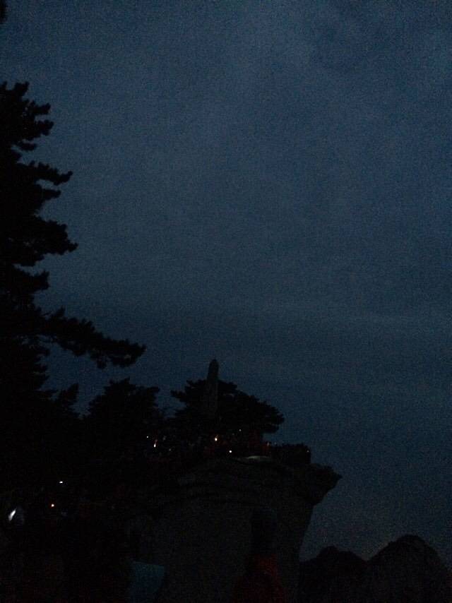 原本担心一个个会被五岳最险累的腰酸背痛,结果都像打了鸡血样的往上爬背的水也还有剩。温差很大,越到上面温度越低,晚上没有找到避风处,在外面打牌聊天吹凉风。准备凌晨继续启程看日出
