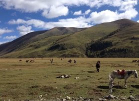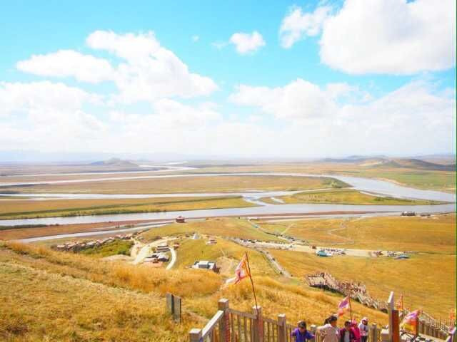 早餐在客栈附近吃了早餐,这里的羊肉粉都是12元一碗,羊杂汤25元一碗,有些小贵啊,7人早餐吃去一百多,比晚餐还贵的早餐。餐后一路向西,路过红原大草原,早上8点多的阳光好刺眼,阳光照在身上暖洋洋的,一路过去草地都黄了,天很蓝,好多牦牛啊,还有绵羊,蒙古包,终于弥补了昨天的遗憾,本以为见不到草原的美景了,结果一路来都是美景。路上看到很多骑着马放牧的牧民,友好的藏民,知道我在给她拍照,还特意转身冲我笑笑,招招手,牦牛似乎习惯了车来车往,都在悠哉悠哉地吃着草,路上也遇到了很多大批过马路的牦牛,车子就这样走走停停,从红原县城到黄河九曲第一湾的路况还是不错的,中午11点左右到达黄河九曲第一湾大门,门票65,强制被要求买了保险5元,在进入景区的路上看到几个像寺庙,好奇心驱使我们停车进去,寺庙门是紧闭着的,不知道是不是还没建成使用, 大家在那里拍了几张照片,走来了一群喇嘛,好像是下课后去吃饭,人手一个碗,看到我们在拍照,喇嘛友好的冲冲我们笑笑,拍了几张相片速度赶往下一景点,到了观景台,停满了车,我们只能把车停在路边,因为没有买观光电梯票,所以只能自己走路上去了,正午的太阳能把人晒晕啊,天空好漂亮,才上到一半就累得气喘吁吁,然后我们的摄影师就开始各种拍了,大家尽情摆POSE。在第二个观景台遇到一位藏族的妈妈,大家都要求和藏家妈妈合影,藏家妈妈也很热情和大家合影,虽然观景台只爬了一半,但是已能看完大半个全景了,也没精力继续最高观景台爬了,只能作罢下山了。中午在景区附近吃了中餐,下午继续赶路。从红原大草原一路走,经过若尔盖大草原,看过早上的红原大草原,大家对下午的若尔盖大草原没有了兴奋感,草原都差不多吧,只是下午的路况实在很糟,很多路还在修路,山路特别多,还是要小心行驶。过了若尔盖,往花湖方向走的路况很好,可是过了花湖往久治方向的路况实在糟透了,说是县级路,但是全程都是沆洼之地,而且都是很大的沆洼,100多公里的路程我们走了差不多4小时,一路上冷风那个吹啊,一抬头发现头顶上的星星好多好多,每一颗都是又大又亮,星空漂亮极了,只可惜手机拍不出这美丽的星空,在草原上看星星该是多浪漫的事情,这给又冷又饿还在颠跛赶路的我们带来一丝兴奋,9点多才到了班玛县,这是一个好小的县城,找了一家餐馆吃晚饭,一进门就每人上了一大杯的茶叶泡水,点了特色招牌菜手撕羊肉,这里的羊肉都是带骨头称斤的,2斤也没得几块肉啊,不过茶水倒是不错的,好大一杯还免费,一路走来免费的只有白开水,只在这里看到了免费的现泡的茶水,晚饭时间已是10点多了,饭后都11点多了,又开始苦逼的找地方住宿,在县城转了几圈,最后找到了一家带独立卫浴的客栈,130一晚,当时时间已过了12点了,住宿条件实在不好,卫生很差,基本就是不打扫的那种,卫生间地上可见死虫子、烟头,马桶到处是污渍,要么冰冷的冷水,要么就是烫死人的热水,床单和被套都是黑呼呼的,摸起来感觉潮潮的,第一次住这么差的地方,可是不住也没办法,还有很多人在街上转悠找房呢,小县城的住宿条件估计只能这样了。
