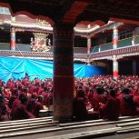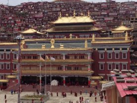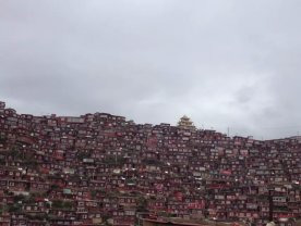 玛曲县城到色达的路程还有100多公里,早上6点起床,客栈老板说去色达有新的大路了,路况好,2小时左右就可以到达了,真是兴奋啊,早上6点半出发了,想上街吃个早点,却发现没一家开门的,好不容易找到一家开门的,结果别人刚开始和面,看来想吃热腾腾的早餐无望了,只有吃昨天没啃完的面包了。去色达的新路应该是刚修好的吧,百度地图都找不到这条路,一路问了几个人才确定,大清晨的看到2个挤奶工在挤奶,走了一小段平路又开始爬盘山公路了,早上7点45分,车外温度达到零度,又是大片的雪景啊,一点不逊色于昨天的雪山啊,到了海拔4518米的德勒湖边,路边停满车了,大片地雪地,随意踩着、奔路着,远处的雪山倒影在湖里,美极了,湖边有一个光着上身的男子摆着大卫的POSE拍照,好有勇气!看着别人玩得开心啊,我们自己也去雪地里玩了一把,开心哦!在雪地里小小激动一把过后,开始有些喘不过气了,唉,高原地区还是少激动吧,高原反应是很严重的事情。玩雪过后又继续上路了,海拔一路下降了,又开始看到一些黄色、绿色植物、蓝天白云小河流了,本该2小时的路程又走了差不多4小时,早上11点终于到达色达县城了,找个地方随便解决中餐吧,在县城吃了一碗抄手,在成都都没想着吃抄手,竟然跑到色达这吃抄手来了。餐后一路向五明佛学院出发了,色达是此次行程的最后一站了,跨越5省只为色达而来啊!县城离佛学院还有40多公里,路上遇到一个重庆的车队,19辆车啊真是壮观。车子开到一半,突然路上有些小堵了,一问才知道这是去往天葬台的分岔路,对天葬有些小怕,还是不看了,一路往前开,下了一个大大的坡,走过一小段烂路,终于看到五明佛学院的牌牌了,人多车多,进个门都是一步一小移的。车子不能直接开上去,只能停在停车场,搭了个面包车上去,开始要价10元,砍价每人5元坐车上去了,到了山上的停车场还要往上走啊,那一片红色的房子跃入眼,果然是红红一片啊,一间一间的红色憎舍层层叠叠地建在山上,随处可见的憎人,还有很多的狗狗,正赶上上课时间,众憎人步履姗姗去上课,手上拿着的经文好大一本,参观了一下诵经佛堂,在佛堂外是要脱鞋才能进入,堂内坐满了诵经的人,听不懂念的是什么经文。从佛堂出来看到一家素食馆,也有些小饿了,进去一人要了一碗酸奶,玲姐姐还去买了10个包子,看来真是饿坏了,一路走来草原上有好多的酸奶出售,一直没有尝过,今天终于有机会一尝牦牛奶了,浓稠的奶加了几勺白糖,看着还是很浓稠,吃一口,哇,不是一般的酸啊,本来晕乎乎的我们好像被打了针一样醒了,从来没吃过这么酸的酸奶,不习惯,楚楚丸说下山的时候记得再去买一杯,等会高原反应晕车的时候就吃一杯马上清醒了。哈哈,一路说着笑着向山上走,途中遇到一个很大的转经筒,因为在香格里拉见过世界最大的转经筒,所以对这个大转经筒不足为奇了,这些红房子建得密密麻麻的,可是走的走到巷子里还是能看到房子中间还是有很多小路的,应该通往下山的路是很多的。山上有宾馆,如果想看夜景可以在山上住一晚哦,到了山上往下俯瞰整个佛学院,感觉不如在山下看着好看呢,山上布满了电线杆,山上看到很多非常虔诚的佛学者,真是一步一叩首,这就是信仰!下午4点多下山了,本来阴暗的天突然放晴了,晴天下的红房子才是最漂亮的,在下山的途中又咔咔了几张,下午5点离开佛学院,原来打算走原路回去的,然后别人又给我们指了另一条路,走炉霍道路比较好走,马尔康路好烂,所以我们决定舍近求远从炉霍绕回去了。从色达出来到炉霍一段路是好路,一段路是烂路,路上有交通事故,还堵了一下,318国道有一段路也没完全修好,全是山路,加上天黑路小,行驶缓慢,原计划晚上7点多能到达炉霍县城,结果到了晚上9点多才到,因为吃了前两晚住宿的亏,我们决定先找住地再找吃的,又是一轮折腾,转了几圈都是人满,在小县城里,高档酒店、住宿条件好一点的酒店都是最先满人的,就连公共卫浴的小招待所都基本满人,后来在一个小巷子里的一户藏民家里找到了住的地方,还有2间3人房,60元一个床位,虽说有公共卫浴,可是一个电热水器只能供2人洗,第三人要等好久,那公共卫生间更是无法使用,男女都在一个房子里,就只拿了一块布遮挡一下,又是一晚没洗澡,这已经是第三个晚上没得洗澡了,这对于天天洗澡的南方人来说真的好折磨!安排好住宿就在附近找了家餐馆吃饭,价格还得地道,味道也还不错,老板很热情,第二天早上还在那里继续用了早餐。老板指点我们走石棉到成都比较好,因为石棉有高速路通成都了。