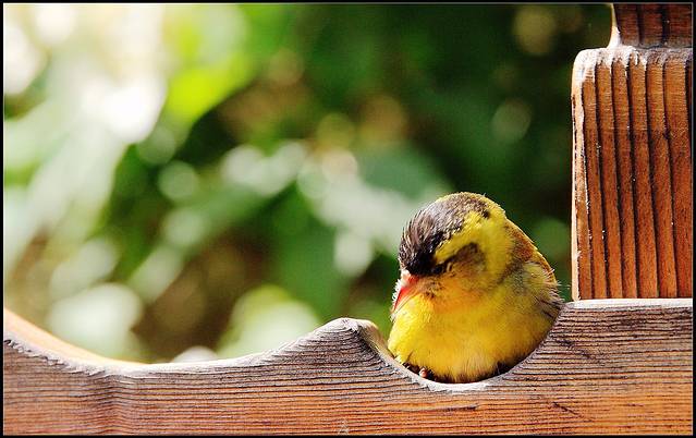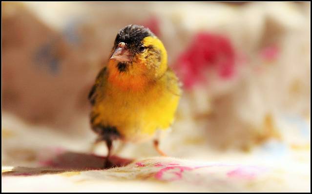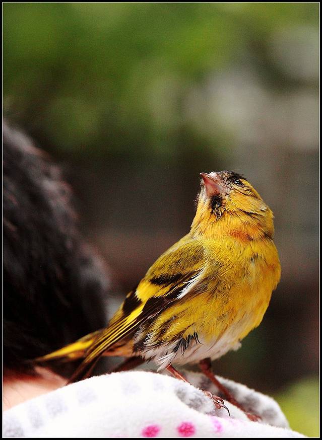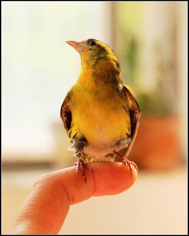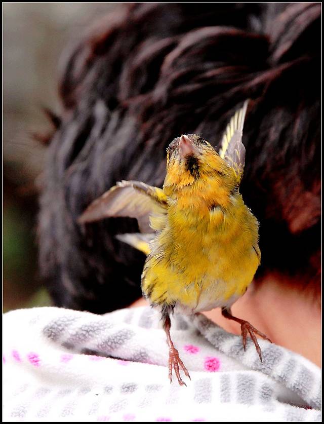 四天前清晨早餐回家路上,一只幼小黄雀穿过明媚阳光落在身边,许是窝中坠落或是学飞尚早,反正就这么惊喜邂逅了。。。