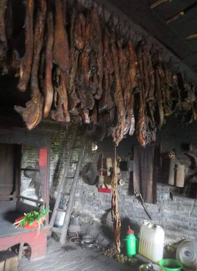 在古寨的公社饭堂里,品尝到了特色的瑶家菜。水酒必不可少,度数不高,入口清香,但也颇有后劲。烟熏肉也不可不提,瑶民将五花肉挂在柴火灶上慢慢熏烤,鲜肉熏烤,没有腌肉的咸味,只有肉香。特别是“瑶王家禽”及盘王鸡,为瑶族特色美食。