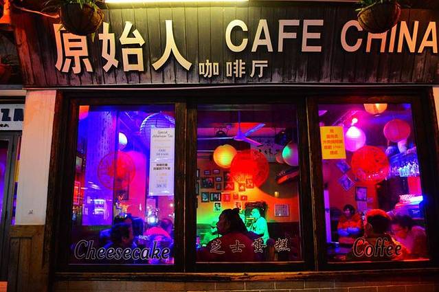 路上很多咖啡馆,咖啡馆里有很多外国朋友