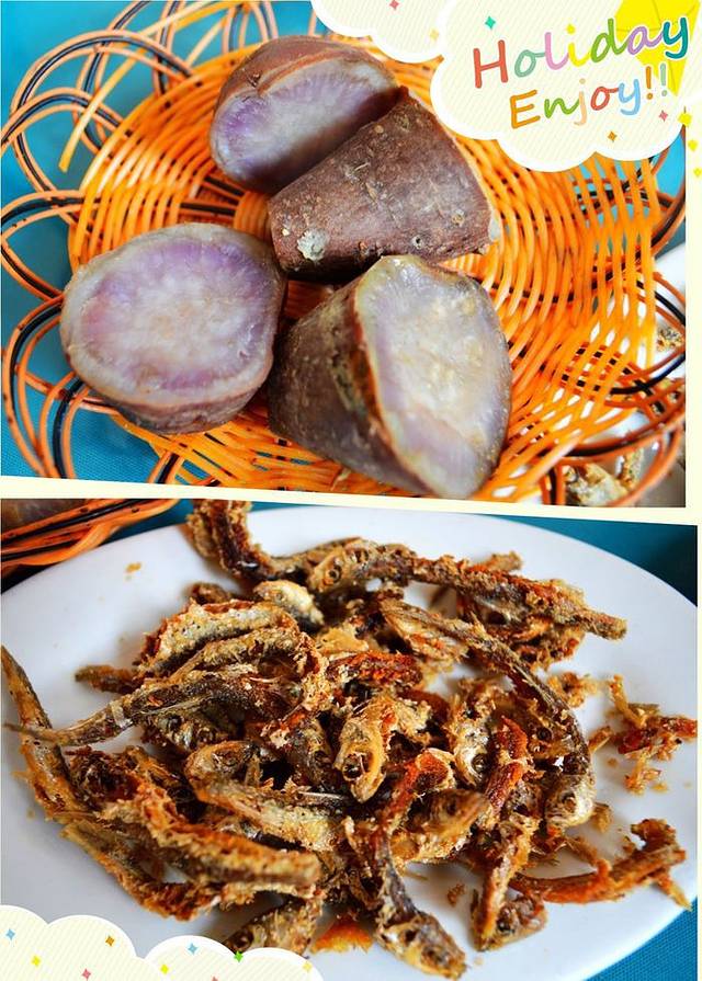 景区里的午餐,超级赞的地瓜、野生小鱼