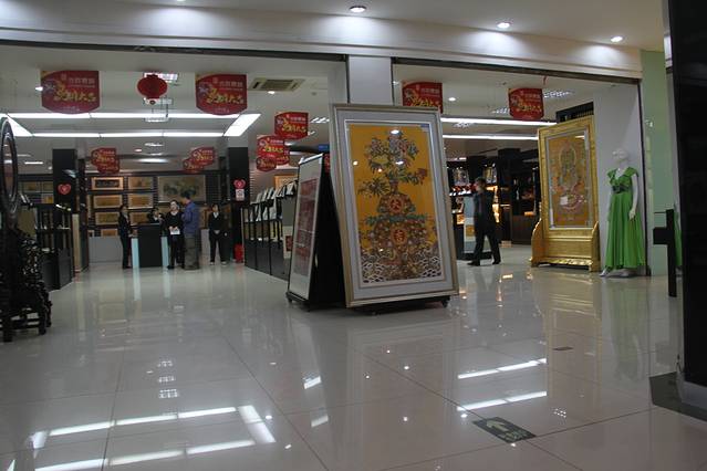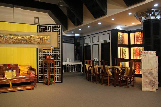 博物馆一共三层楼,一楼是商场,卖的都是云锦制品,二楼是博物馆和现场演示,不仅陈列了各式云锦制品,还有大型的纺织车,有工作人员现场演示织造云锦。