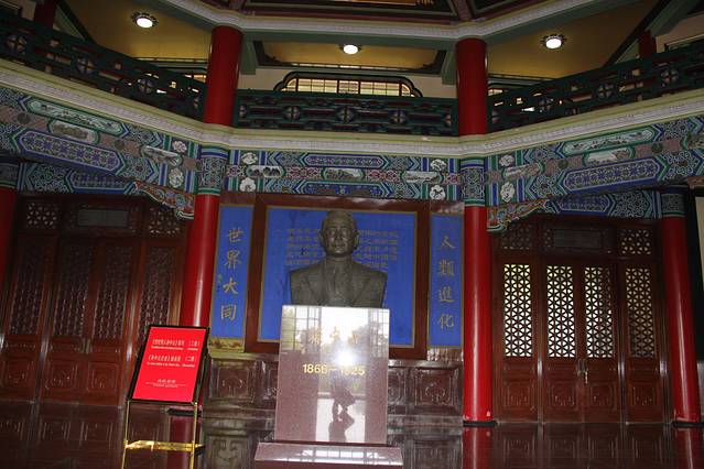 来到孙中山纪念馆,首先映入眼帘的是石阶上矗立的一座孙中山全身铜像。这尊铜像定格于孙中山发表演说的姿势,气势磅礴,栩栩如生。我不得不从仰视的角度,去尽量看清他的脸,力图读出更多的历史信息。