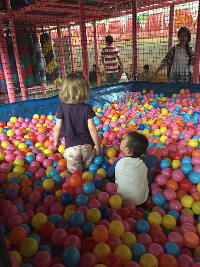 麦兜一直想快点长大,就能去大海洋球池子里面耍了,现在只能在这个小池子里玩了。